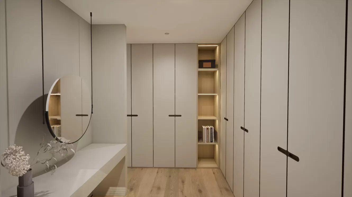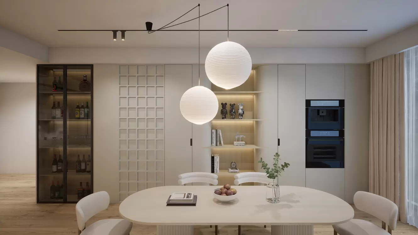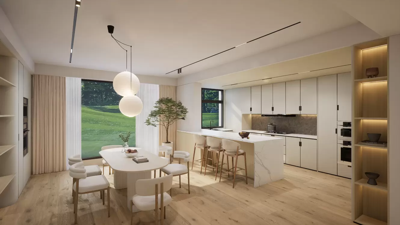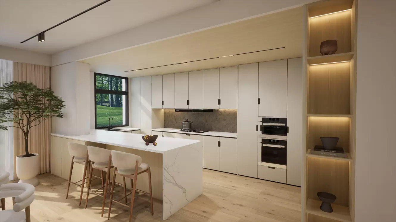Integrată în zona de living deschisă, bucătăria, cu estetica sa minimalistă, creează un mediu fluid și dinamic, care se adaptează ritmurilor vieții de astăzi. Se mândrește cu o insulă ce servește atât ca stație de lucru culinară, cât și ca loc de întâlnire pentru o cină relaxată. Aspectul general coerent și caracterul practic funcțional sunt demonstrate prin utilizarea de K013 și K353 ca decoruri asortate pentru blatul și fațada bucătăriei, împreună cu eleganta linie Slim Line, care prezintă soluțiile coordonate Kronospan.