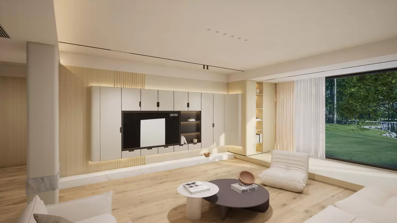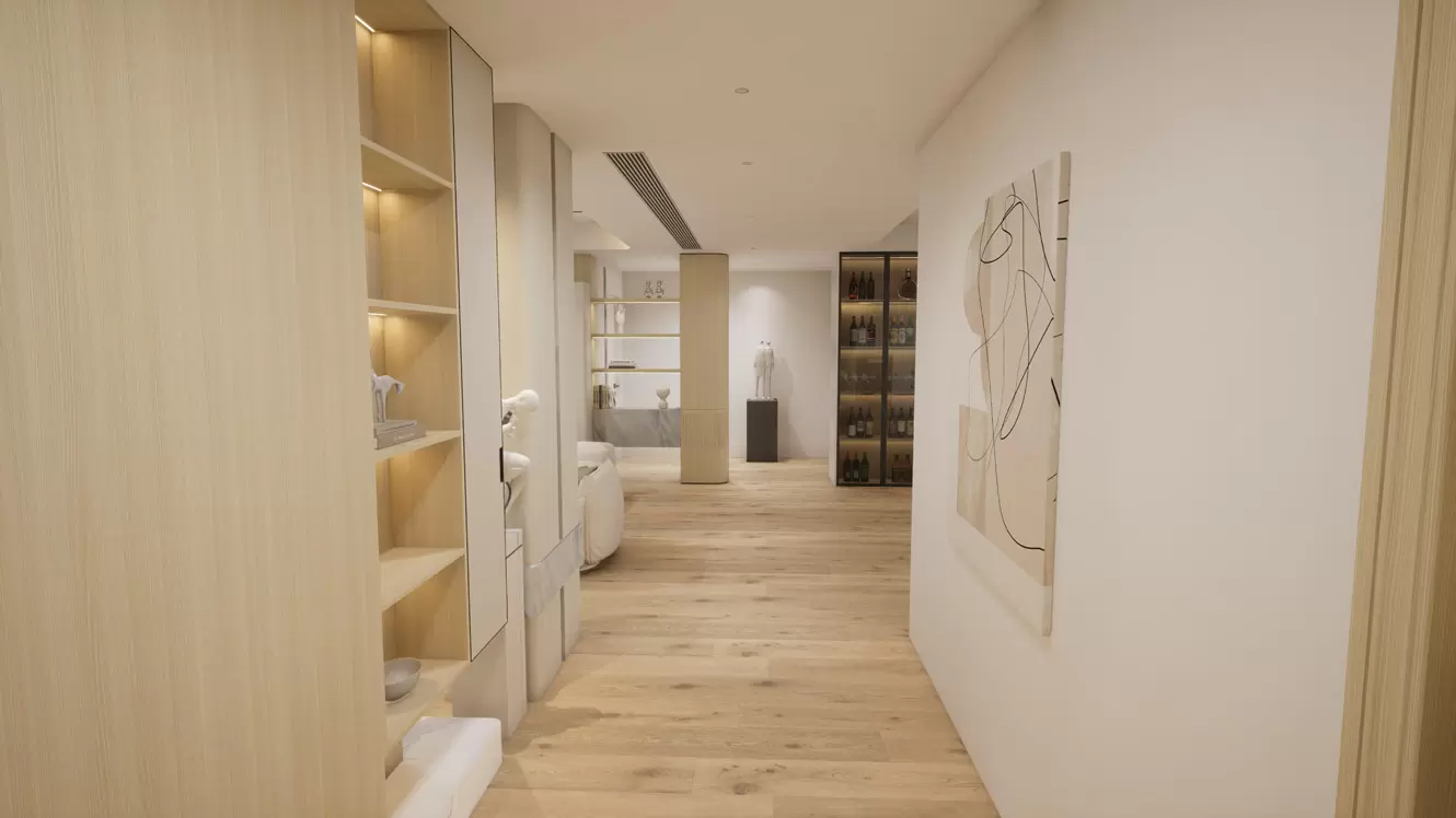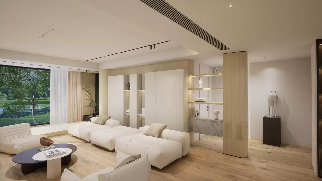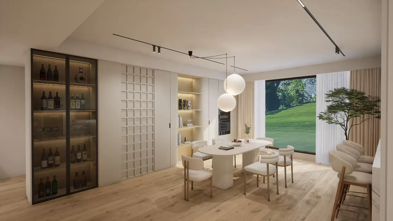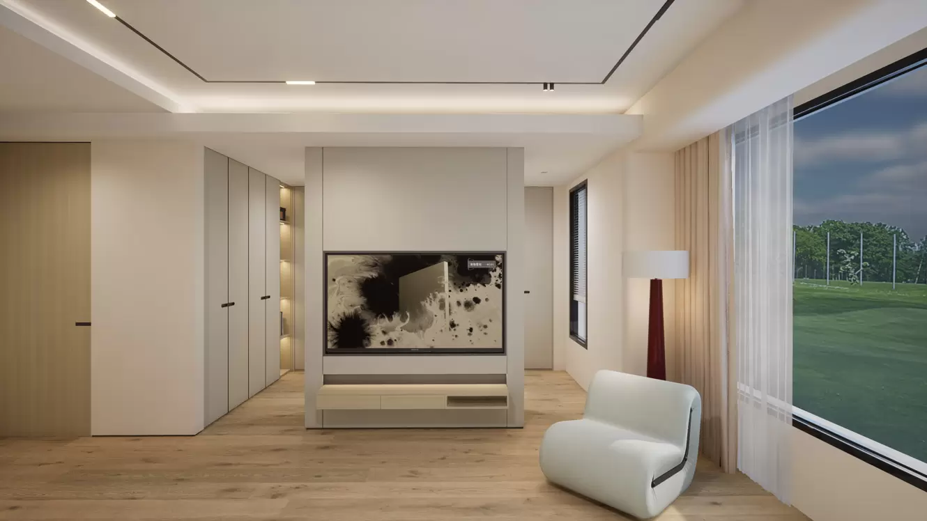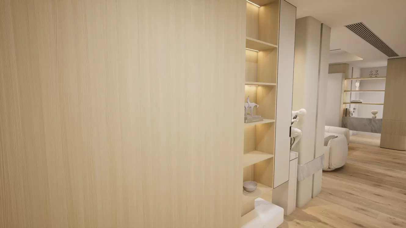 În livingul spațios, confortul întâlnește stilul, invitând oaspeții să se relaxeze într-o atmosferă unică. În prim-planul acestei narațiuni interioare se află decorurile alese cu meticulozitate, care conturează spațiul. Punctul focal în orientare verticală este fagul artizanal Sand. Suprafețele mari pe care le împodobește afișează căldura delicată a fibrei lemnului. În contrast, liniile orizontale din Charcoal Flow și 0190 SL Black conferă o prezență distinctă, dar rafinată, îmbrățișând scaunele moi din mijlocul camerei.