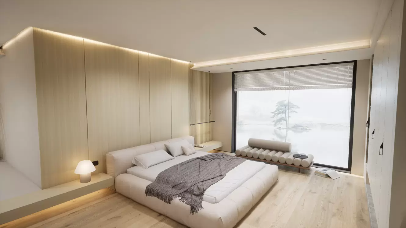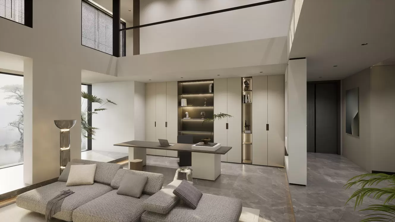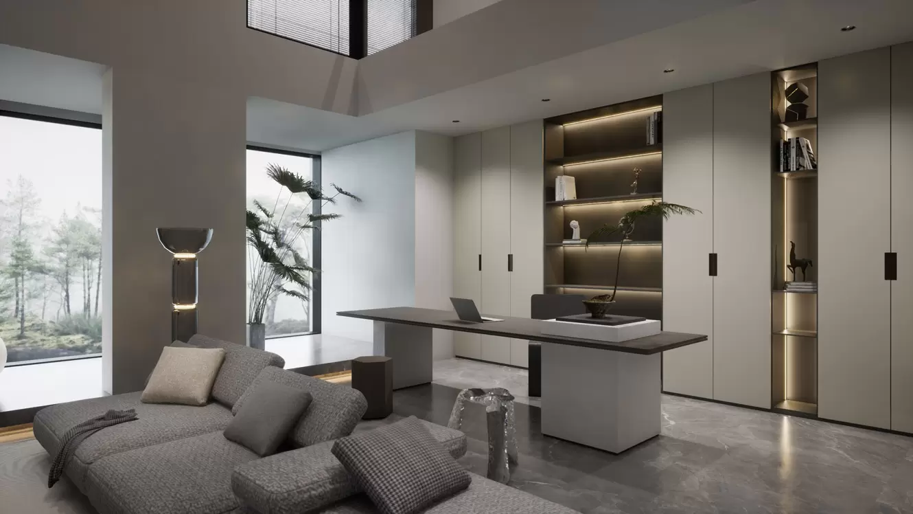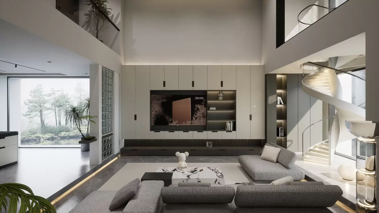 În livingul spațios, confortul întâlnește stilul, invitând oaspeții să se relaxeze într-o atmosferă unică. În prim-planul acestei narațiuni interioare se află decorurile alese cu meticulozitate, care conturează spațiul. Punctul focal în orientare verticală este fagul artizanal Sand. Suprafețele mari pe care le împodobește afișează căldura delicată a fibrei lemnului. În contrast, liniile orizontale din Charcoal Flow și 0190 SL Black conferă o prezență distinctă, dar rafinată, îmbrățișând scaunele moi din mijlocul camerei.
