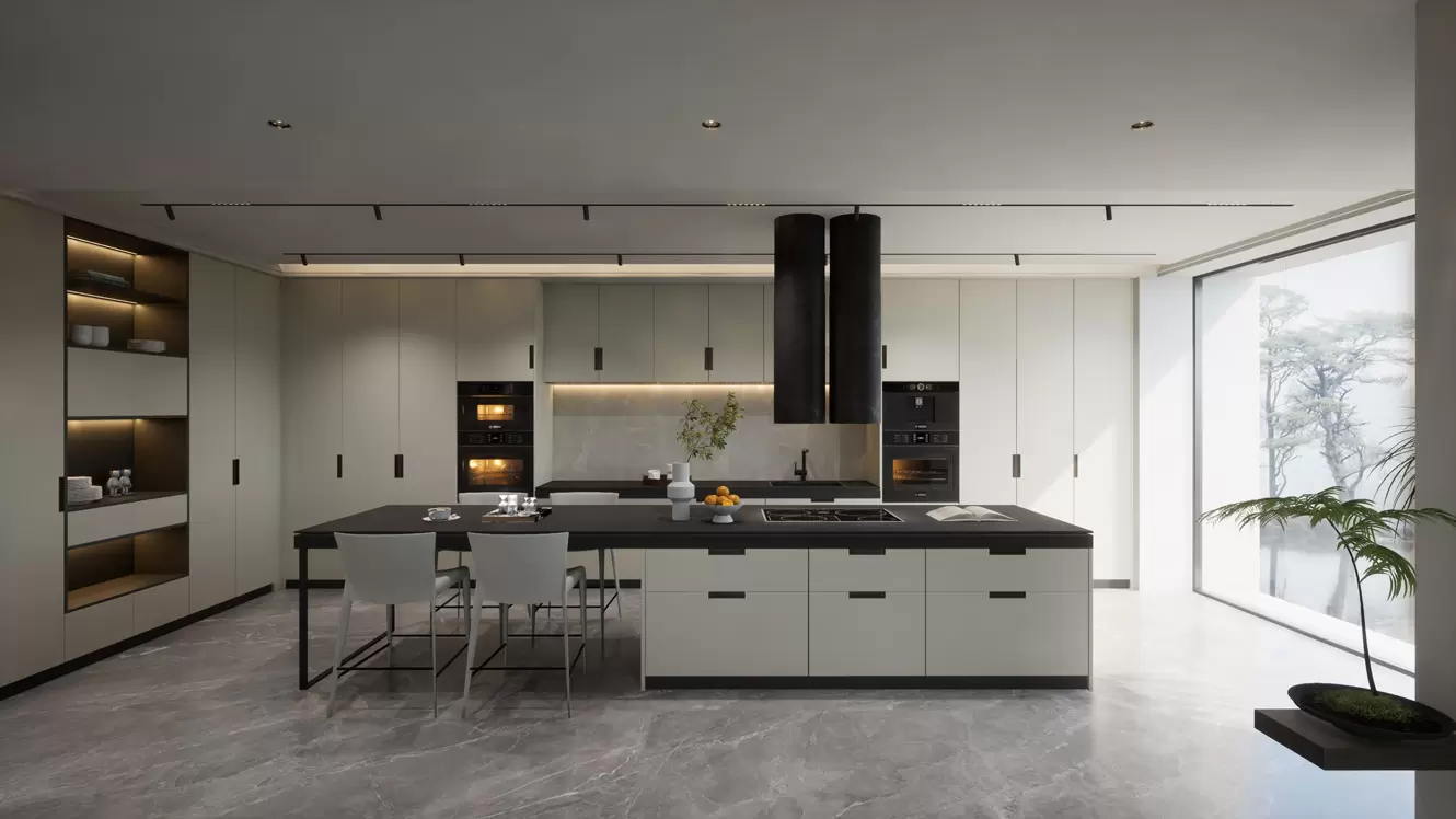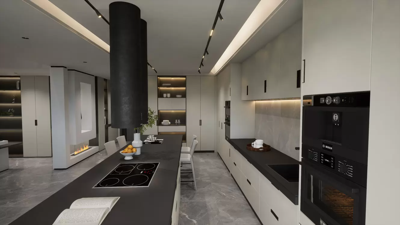 Integrată în zona de living deschisă, bucătăria, cu estetica sa minimalistă, creează un mediu fluid și dinamic, care se adaptează ritmurilor vieții de astăzi. Se mândrește cu o insulă ce servește atât ca stație de lucru culinară, cât și ca loc de întâlnire pentru o cină relaxată. Aspectul general coerent și caracterul practic funcțional sunt demonstrate prin utilizarea de K013 și K353 ca decoruri asortate pentru blatul și fațada bucătăriei, împreună cu eleganta linie Slim Line, care prezintă soluțiile coordonate Kronospan.