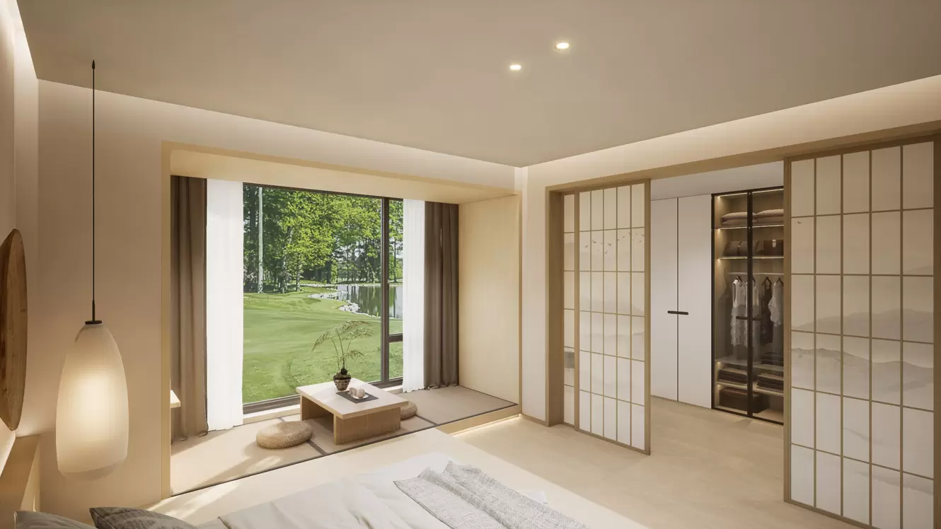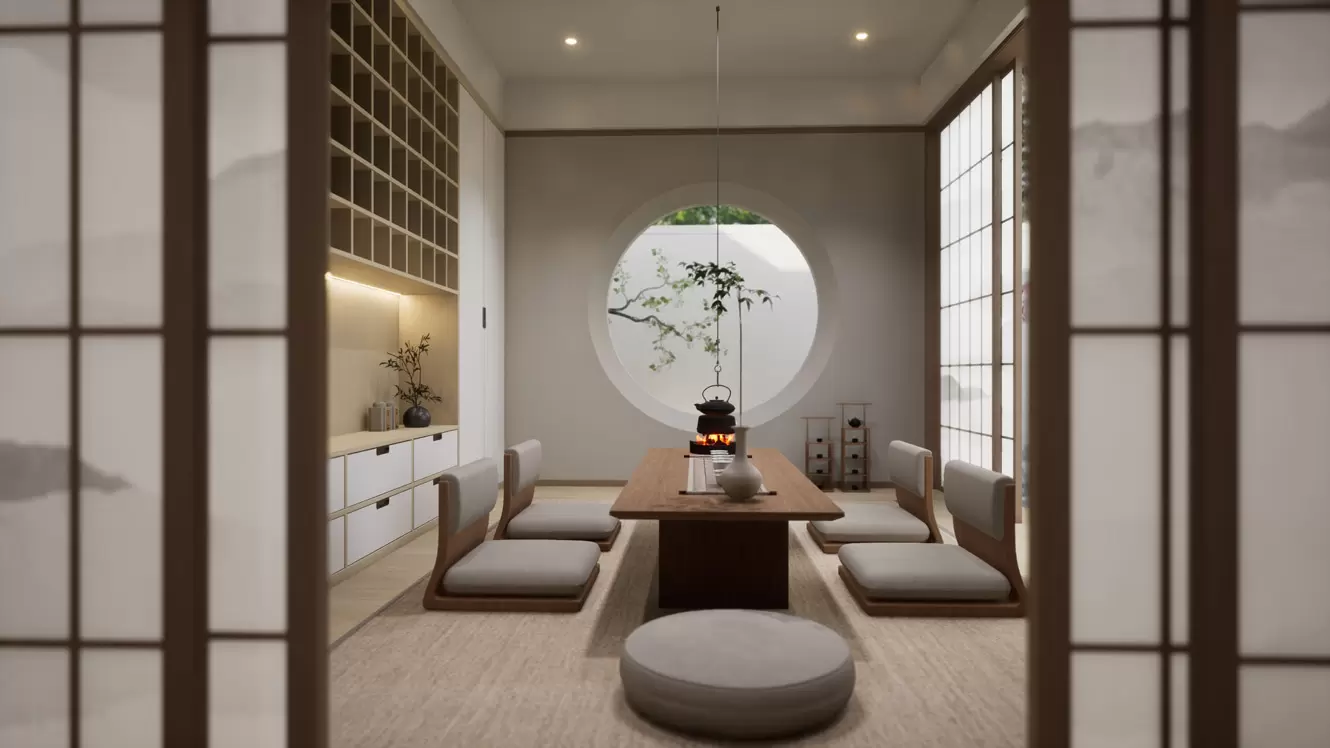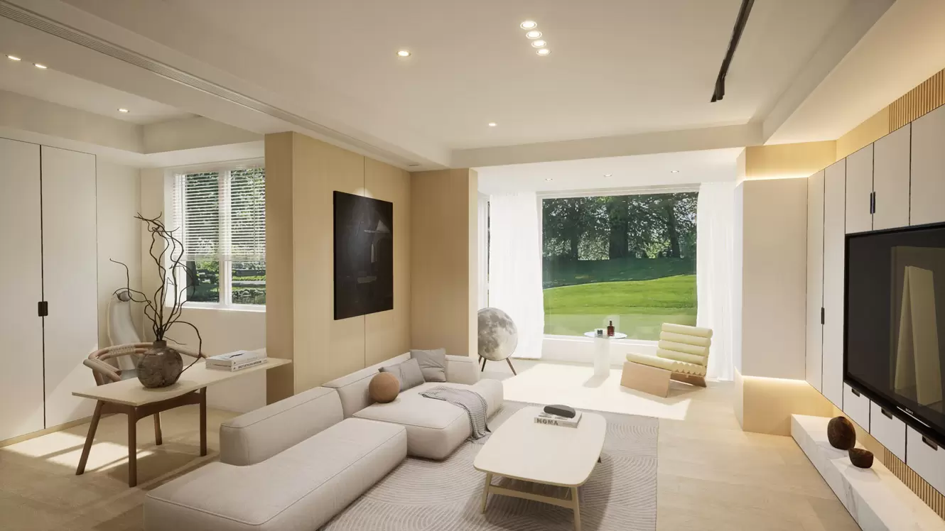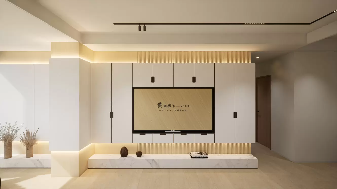 În livingul spațios, confortul întâlnește stilul, invitând oaspeții să se relaxeze într-o atmosferă unică. În prim-planul acestei narațiuni interioare se află decorurile alese cu meticulozitate, care conturează spațiul. Punctul focal în orientare verticală este fagul artizanal Sand. Suprafețele mari pe care le împodobește afișează căldura delicată a fibrei lemnului. În contrast, liniile orizontale din Charcoal Flow și 0190 SL Black conferă o prezență distinctă, dar rafinată, îmbrățișând scaunele moi din mijlocul camerei.