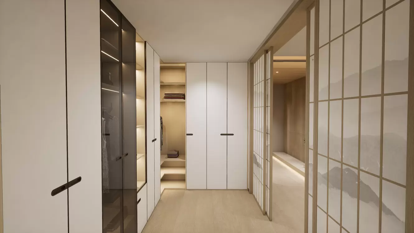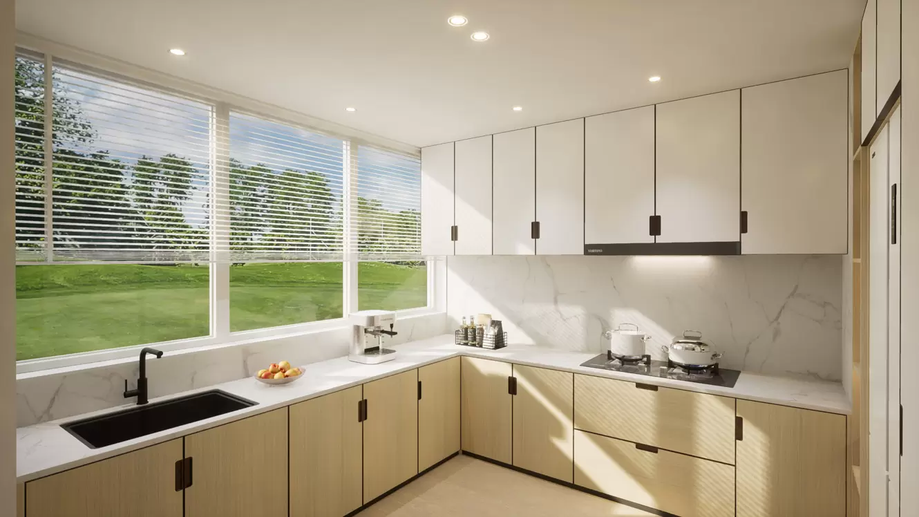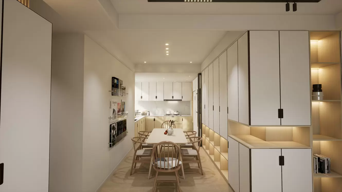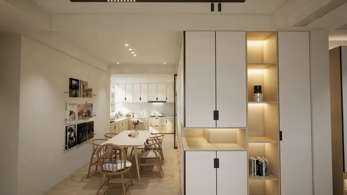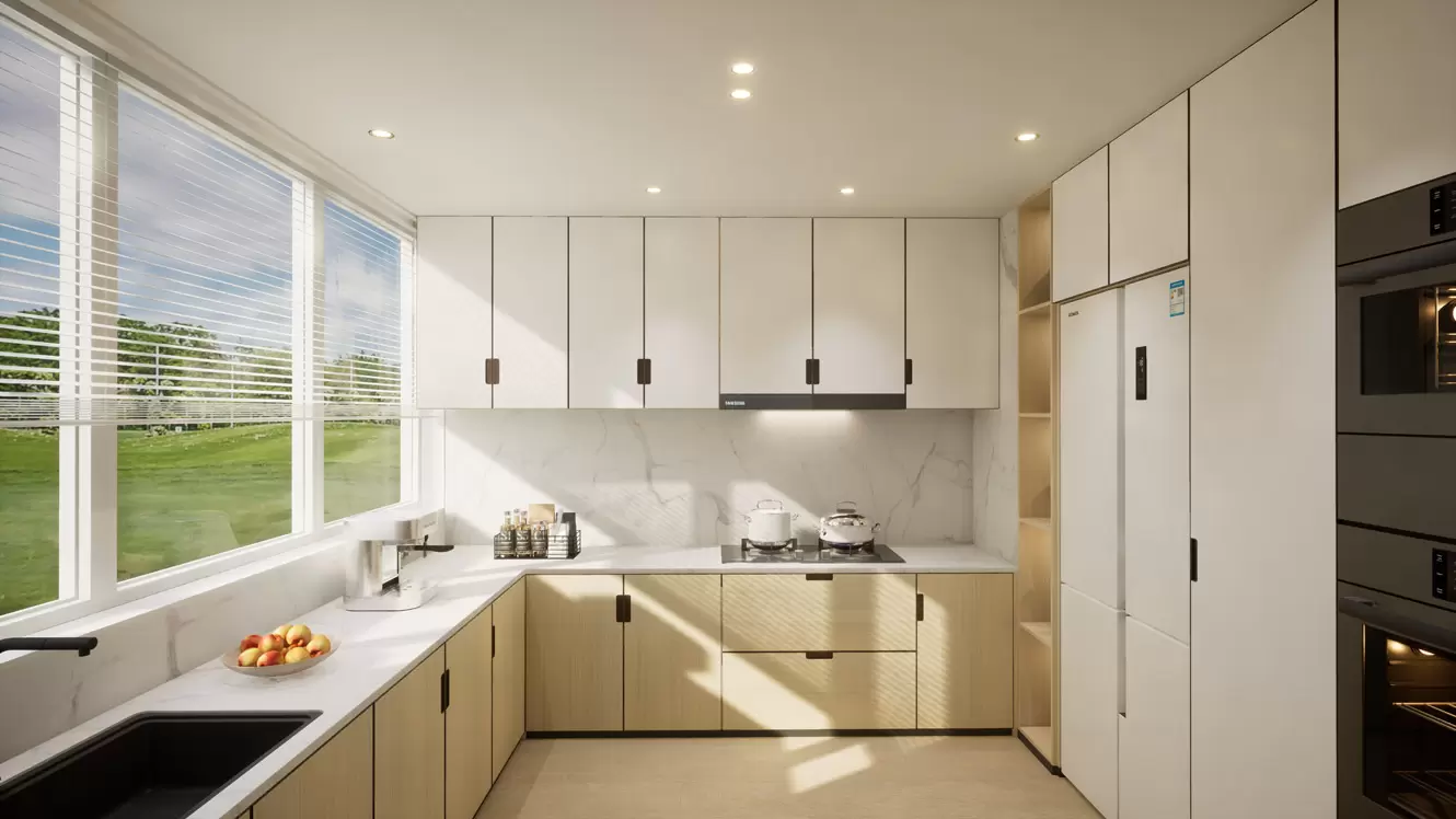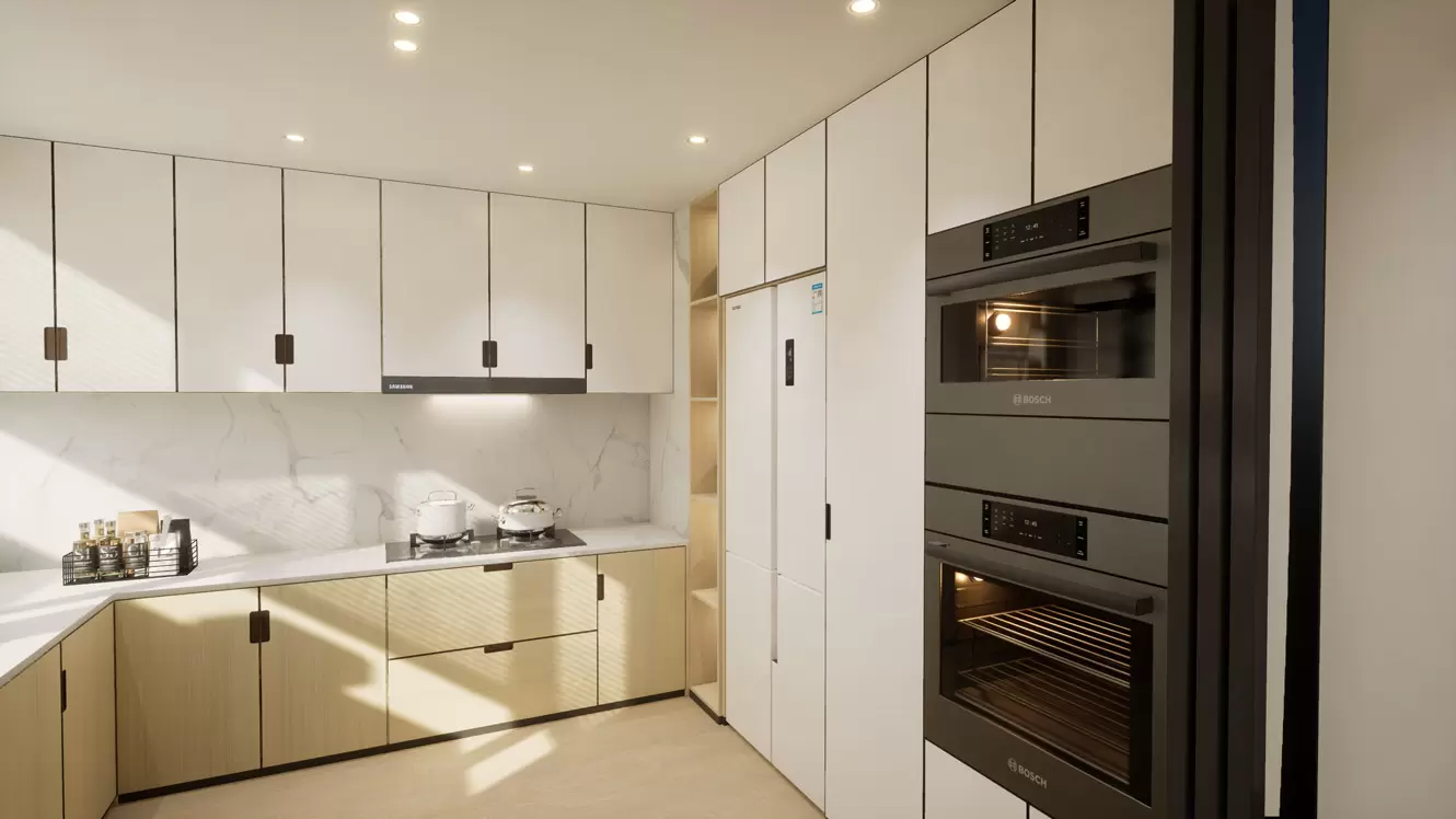 Integrată în zona de living deschisă, bucătăria, cu estetica sa minimalistă, creează un mediu fluid și dinamic, care se adaptează ritmurilor vieții de astăzi. Se mândrește cu o insulă ce servește atât ca stație de lucru culinară, cât și ca loc de întâlnire pentru o cină relaxată. Aspectul general coerent și caracterul practic funcțional sunt demonstrate prin utilizarea de K013 și K353 ca decoruri asortate pentru blatul și fațada bucătăriei, împreună cu eleganta linie Slim Line, care prezintă soluțiile coordonate Kronospan.