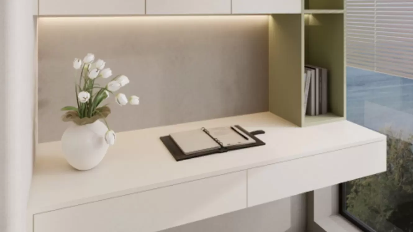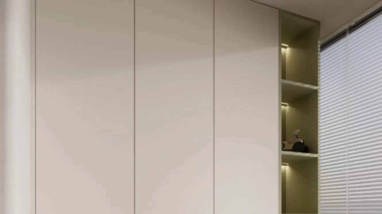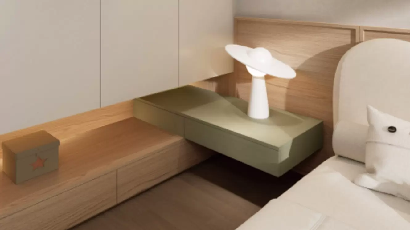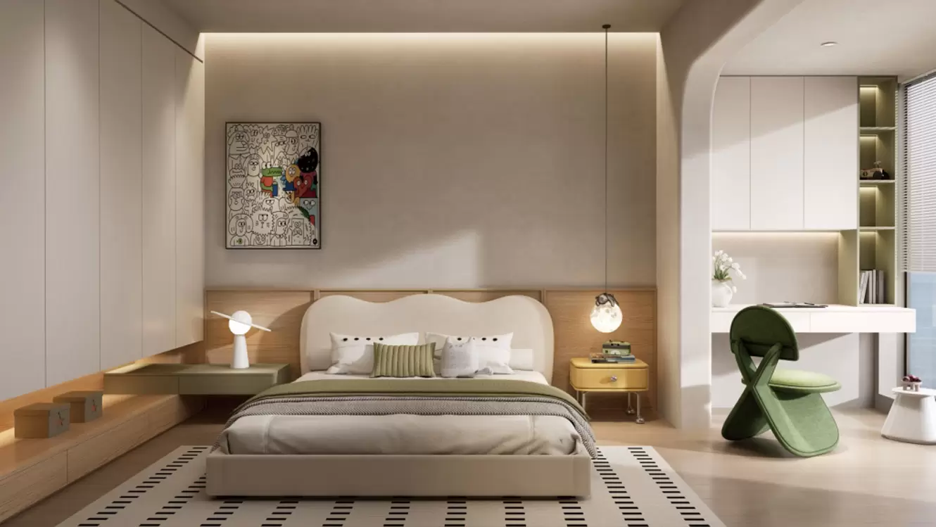 Cameră pentru copii în stil crem, care emană farmec copilăresc prin culoare și design. Culoarea caldă a lemnului din stejarul Dieying Ya este ca un caramel topit, emanând un halou moale, asociată cu o bază de culoare alb-gheață pură, mătăsoasă ca cremul, creând o atmosferă caldă. Verdele măsliniu o înfrumusețează, injectând vitalitate proaspătă în spațiu, ca o vlăstă de primăvară, rupând monotonia. Furnirul stratificat de stejar este folosit pentru fundalul noptierei și pentru unele dulapuri, ca și cum ar introduce atmosfera pădurii în interior, aducând o textură naturală. Dulapul și biroul alb-gheață sunt simple și elegante, îndeplinind funcțiile de depozitare și învățare. Scaunul cu formă unică de verde măsliniu stimulează curiozitatea copiilor printr-o postură vioaie. Lenjeria de pat și perdelele încorporează elemente din aceeași schemă de culori, adăugând vitalitate și energie. Patul are linii rotunjite pentru a asigura siguranța copiilor.